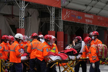 HONG KONG (Reuters) -A fire broke out on Wednesday in Hong Kong’s World Trade Centre, trapping about 150 people on its roof, and 13 people were injured before firefighters put out the blaze, police and the fire department said.