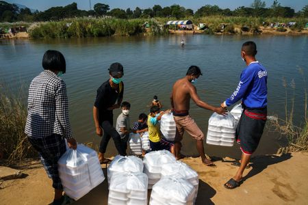 THAI-MYANMAR BORDER (Reuters) – Thousands of Myanmar villagers are living under makeshift tents alongside a river that borders Thailand, fearful of returning to homes which they said had been bombarded by military air strikes but reluctant to seek refuge across the frontier.