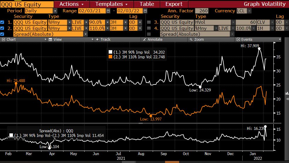 Such sentiment explains why the price of bearish options on the biggest tech ETF held relatively firm during Thursday’s regular-session bloodbath. The skew of three-month QQQ puts betting on a 10% decline fell relative to calls wagering on a comparable gain, with the spread narrowing by roughly 5 points to 11.5.