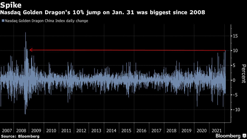 The 93-member measure of U.S.-listed Chinese shares is up over 5% this week — exceeding a near-2% climb in global equities — partly on bets that encouraging recent commentary from China’s cyberspace watchdog signals Beijing’s clampdown on the technology sector will ease.