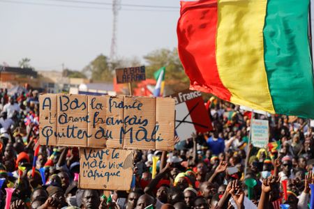 Bamako (Reuters) – Thousands of anti-French protesters took to the streets of Mali’s capital on Friday waving Russian flags and burning cardboard cut-outs of French President Emmanuel Macron in celebration of the expulsion of France’s envoy in Bamako.