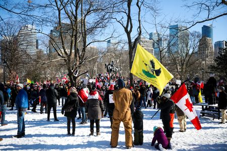 In Toronto, about 500 healthcare workers and supporters rallied downtown in opposition to the trucker convoy, according to a Reuters witness.