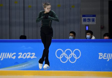 BEIJING (Reuters) -Russia’s 15-year-old figure skating sensation Kamila Valieva giggled with her coaches but turned serious for her own routine as she practiced on Thursday at the Winter Olympics despite reports of testing positive for a banned substance.