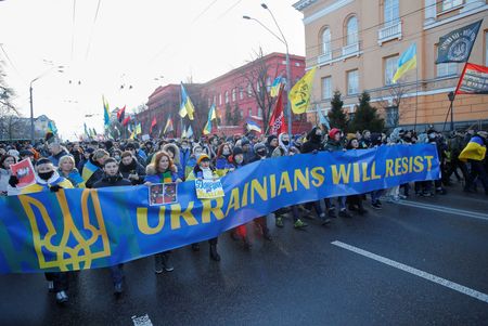 KYIV (Reuters) – Several thousand Ukrainians rallied in Kyiv on Saturday to show unity amid fears of a Russian invasion, as Ukraine’s leader told people not to panic and pushed back against what he said was a glut of bleak war predictions being reported in the media.