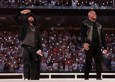 LOS ANGELES (Reuters) -Los Angeles-area natives Snoop Dogg and Dr. Dre united for “California Love,” surprise guest 50 Cent hung upside down and rapper Eminem took a knee as superstars of hip-hop performed a high-energy halftime show at Sunday’s Super Bowl.