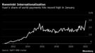 Payments using the renminbi, as the currency is also known, jumped to a record 3.2% of market share, according to data from the Society for Worldwide Interbank Financial Telecommunications, breaking through its previous high set in 2015 that came on the back of a currency devaluation in a bid to increase exports.