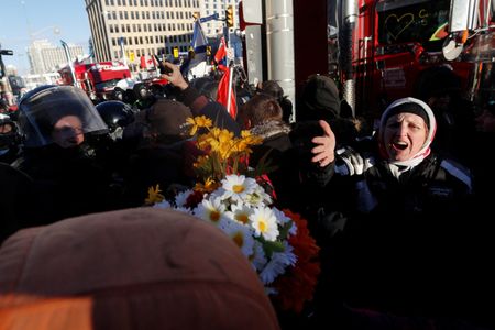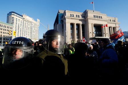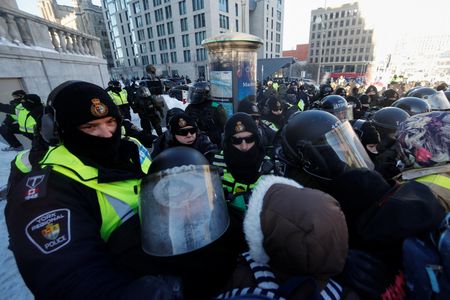 OTTAWA (Reuters) -Police, some on horseback, pushed into crowds of demonstrators to clear them from the streets of downtown Ottawa on Friday, arresting more than 100 and hauling away vehicles that had been blocking the capital’s core for over three weeks in a protest against pandemic restrictions.