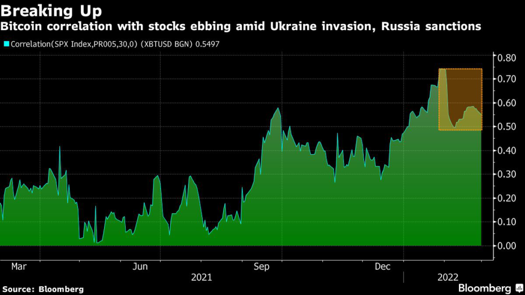Bitcoin’s outperformance over the past few days of intensifying combat in Ukraine and escalating sanctions on Russia has some bulls pointing to a break from the narrative that crypto is just another risk asset.