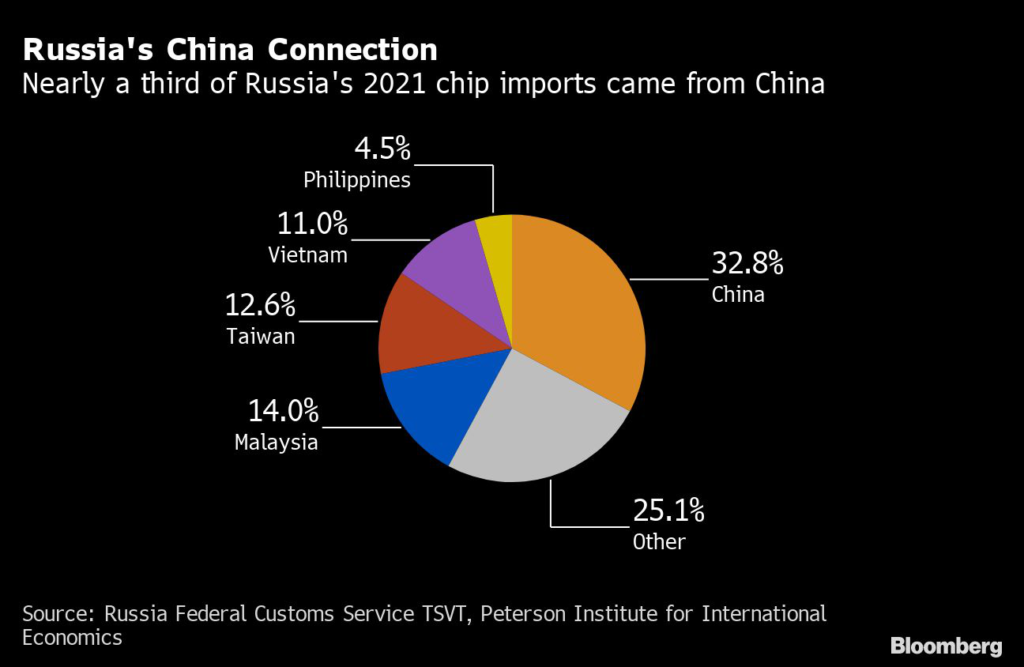 China is Russia’s biggest supplier of electronics, accounting for a third of its semiconductor imports and more than half of its computers and smartphones.
