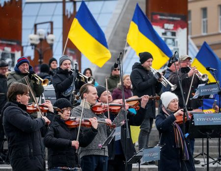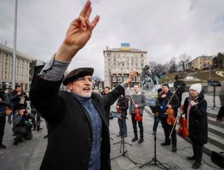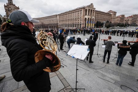 KYIV (Reuters) -On a Kyiv square where recent popular uprisings have scuppered Moscow’s ambitions in Ukraine, an orchestra assembled before a small crowd on Wednesday to play the national anthem as Russian forces advanced on the city.