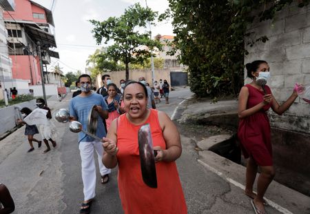 Others stood in small groups outside their homes or gathered in the street, some holding handwritten anti-government banners or waving the national flag.