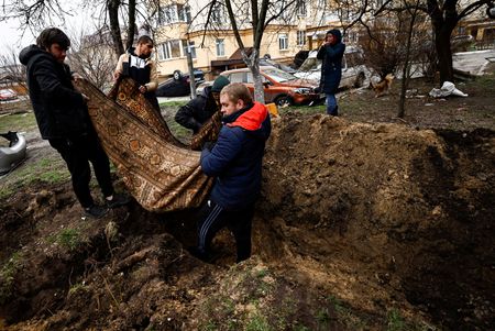 He and fellow residents in a housing complex in the ravaged town of Bucha, where Reuters has found a trail of what officials say are extra-judicial killings since Russian troops pulled back last week, grabbed shovels and dug a shallow grave on a grass verge by one housing block.