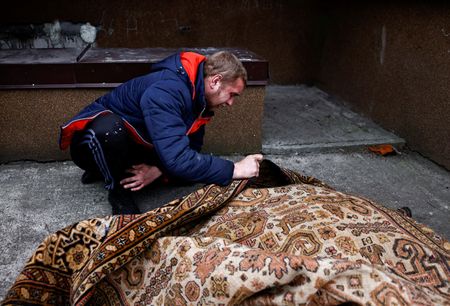 BUCHA, Ukraine (Reuters) – Sobbing uncontrollably, Serhii Lahovskyi nuzzles against the shrouded corpse of his closest childhood friend, who disappeared when Russian troops occupied the Ukrainian town of Bucha near Kyiv and was found shot through the head and dumped in a stairwell.
