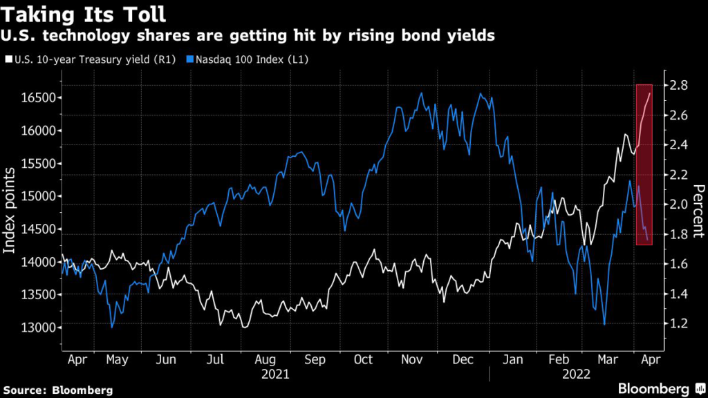 The Nasdaq 100 fell as much as 1.6% on Monday as yield on 10-year U.S.