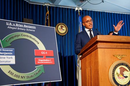 NEW YORK (Reuters) -New York Lieutenant Governor Brian Benjamin, the state’s No. 2 official after Governor Kathy Hochul, resigned on Tuesday after being charged with bribery and fraud for allegedly directing state funds toward a real estate developer in exchange for campaign contributions.