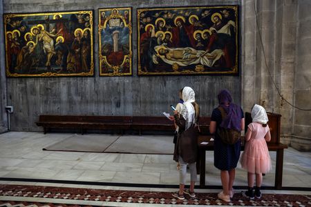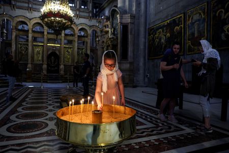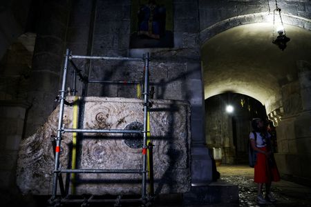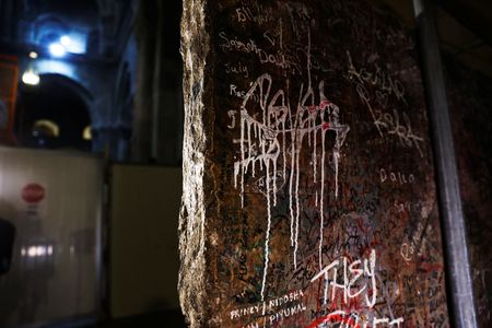 JERUSALEM (Reuters) – Pressed against a wall in a back corridor of Jerusalem’s Church of the Holy Sepulchre, a stone slab bore testimony only to the graffiti etched on it by multitudes of pilgrims through the ages.