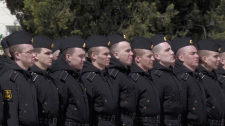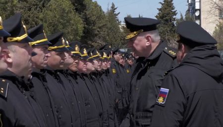 The Russian defence ministry released a 26-second video showing Yevmenov and two other officers standing outside in front of around 100 sailors on a parade ground.