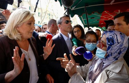 PARIS (Reuters) – French far-right presidential candidate Marine Le Pen’s interests are tied to Russia’s leadership, President Emmanuel Macron said in a TV debate with his far-right challenger on Wednesday.