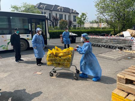 SHANGHAI (Reuters) – To prepare the 3,000-plus orders of vegetables, meat and essentials her Carrefour supermarket sends out every day to locked-in Shanghai residents, manager Zhang Wei wakes at 5 a.m.