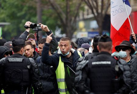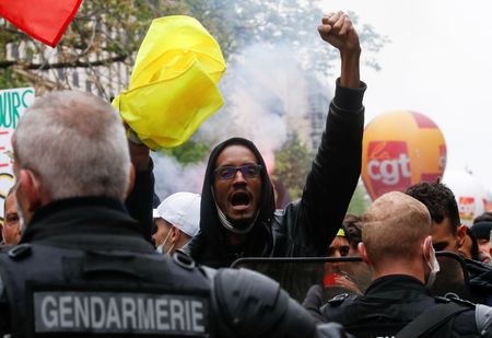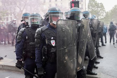 PARIS (Reuters) -Police fired tear gas to push back black-clad anarchists who ransacked business premises in Paris on Sunday during May Day protests against the policies of newly re-elected President Emmanuel Macron.