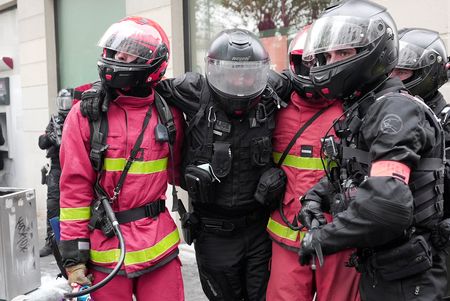 Most were peaceful but violence broke out in the capital, where police arrested 54 people, including a woman who attacked a fireman trying to put out a fire, Interior Minister Gerald Darmanin said on Twitter.