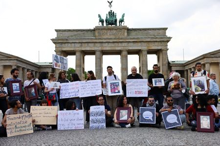 Derki, with other Syrians, laid down framed photos of their detained family members in front of Berlin’s Brandenburg Gate.
