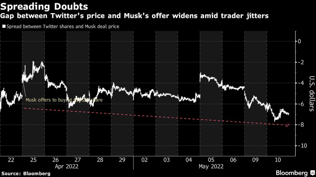 (Bloomberg) — Traders are the most skeptical they’ve ever been about whether Elon Musk will actually complete his proposed purchase of Twitter Inc.