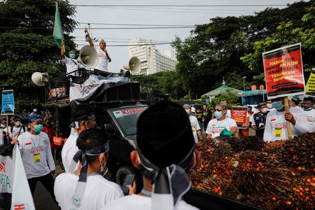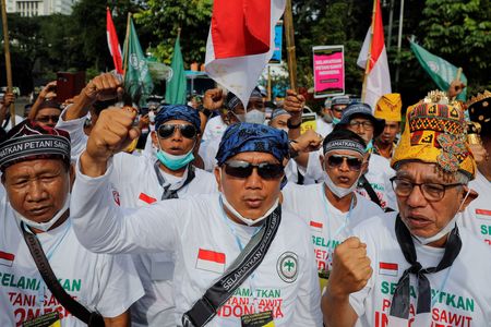 JAKARTA (Reuters) -Hundreds of Indonesian smallholder farmers staged a protest on Tuesday in the capital Jakarta and in other parts of the country, demanding the government end a palm oil export ban that has slashed their incomes.