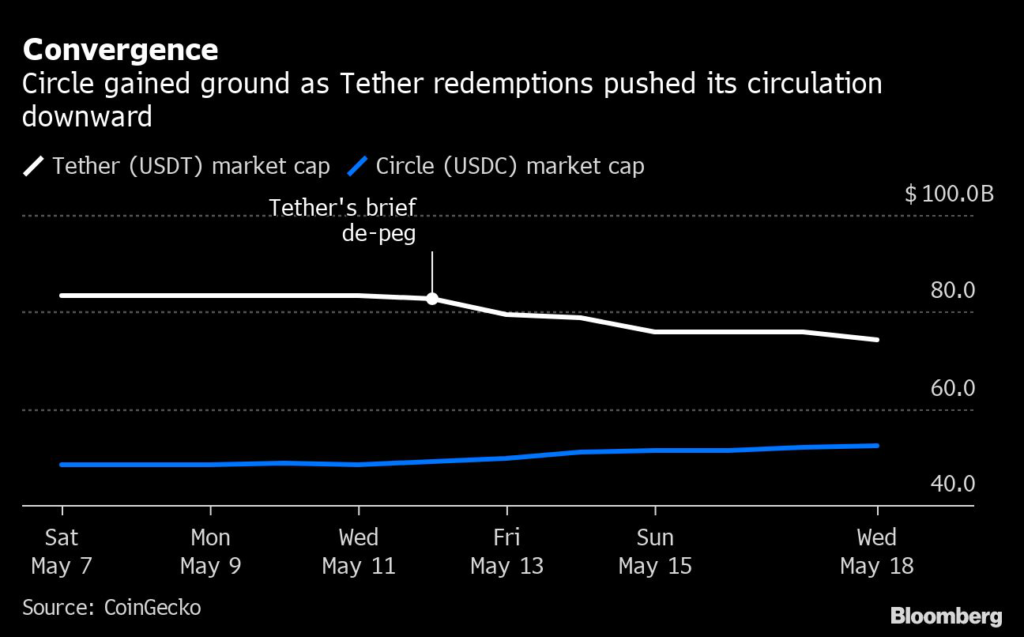 (Bloomberg) — Circle’s USD Coin is reaping the benefits as circulation of Tether, the world’s largest stablecoin and its closest rival, continues to decline in a wave of redemptions.