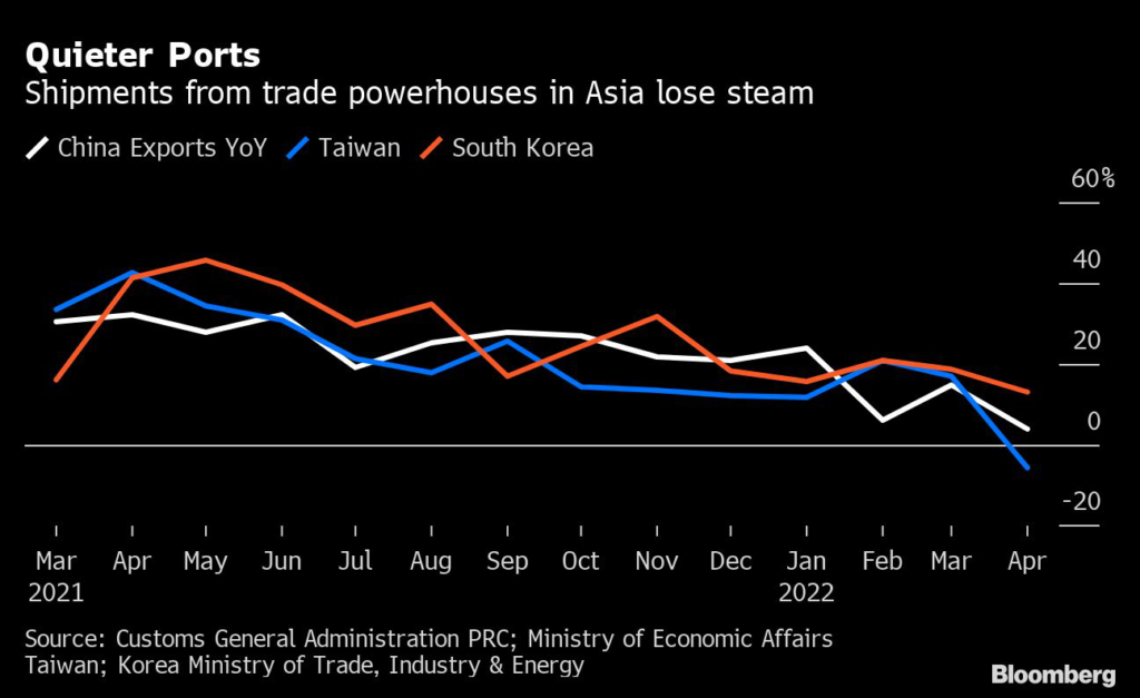The Bloomberg Trade Tracker shows the latest evidence of a softening in shipments: Throughput at some of the world’s busiest ports took another hit in April.