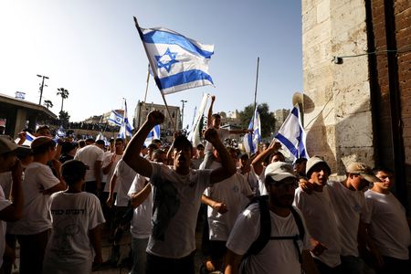 JERUSALEM (Reuters) – Tens of thousands of flag-waving Israeli nationalists, some chanting “Death to Arabs”, marched through the Muslim quarter of Jerusalem’s Old City on Sunday, defying threats of retaliation from Palestinian militants.