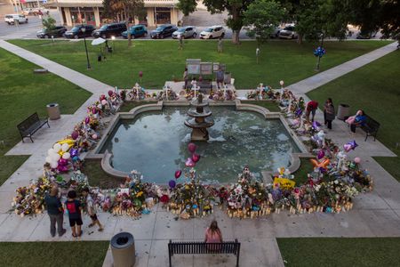 Families lingered around the fountain and placed flowers, balloons and stuffed animals at 21 crosses erected to honor the dead. Kids wrote messages on the sidewalk in chalk.