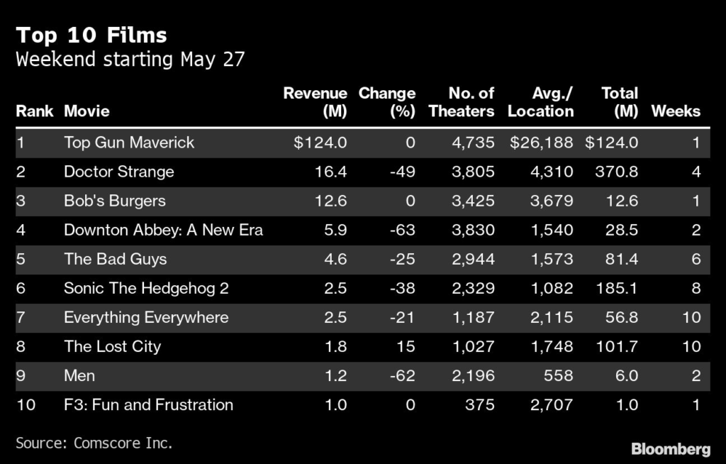 (Bloomberg) — “Top Gun: Maverick” topped the Memorial Day weekend box office, appealing to a broad swath of viewers, including many who have been slow to return to theaters.