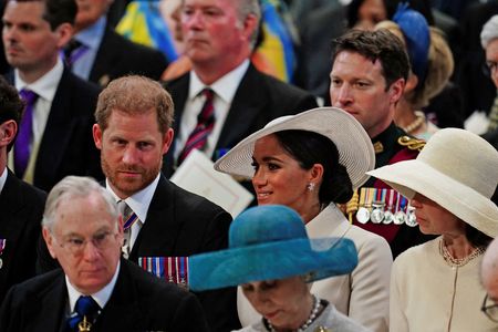 LONDON (Reuters) – Prince Harry and his wife Meghan were greeted with cheers and some jeers as they joined the royal family at a thanksgiving service on Friday for Queen Elizabeth, their first public appearance together in Britain since quitting royal duties