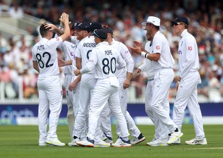 Debutant Matthew Potts, who took four wickets in the first innings, picked up 2-50, while the returning pace duo of Jimmy Anderson and Stuart Broad also bagged a wicket each.