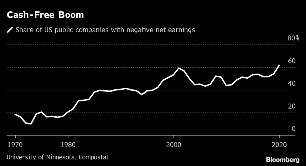 US public firms with negative net earnings reached a record at the end of 2020, accounting for 62% of the group, compared with 18% in 1970, according to a new paper by University of Minnesota academic.
