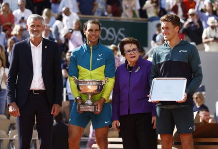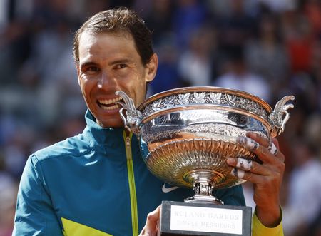 PARIS (Reuters) -Rafael Nadal regained his aura of invincibility on clay on Sunday by brutally crushing Casper Ruud to lift the French Open trophy for an incredible 14th time and widen the gap at the top of the men’s all-time list of Grand Slam winners.
