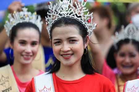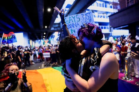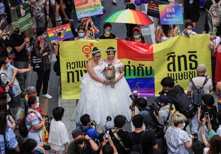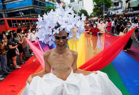 BANGKOK (Reuters) – Thousands of members of Thailand’s LGBTQ+ community raised rainbow flags in the country’s first official pride parade on Sunday evening to celebrate pride month and support gender equality.