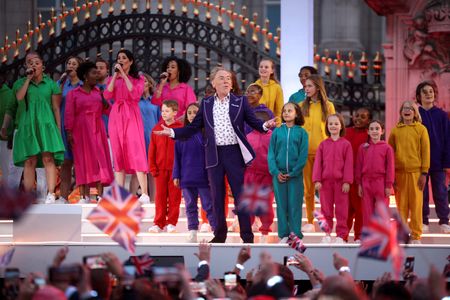 Charles and wife Camilla; son William, wife Kate and their two eldest children sang along with the crowd before an aerial drone light show projected images into the sky, including the monarch on a stamp and the outline of her dogs.