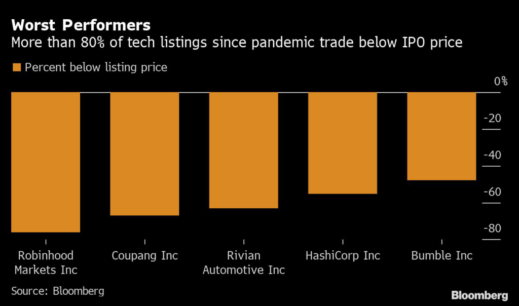 More than 80% of tech-related initial public offerings since March 2020 are trading below their listing price, according to data compiled by Bloomberg that looked at IPOs of at least $500 million.