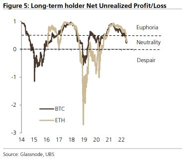 Bitcoin, down about 20% this week, fell to as low as $21,932 on Tuesday, putting it squarely below the average investor cost base of $23,500, according to UBS.