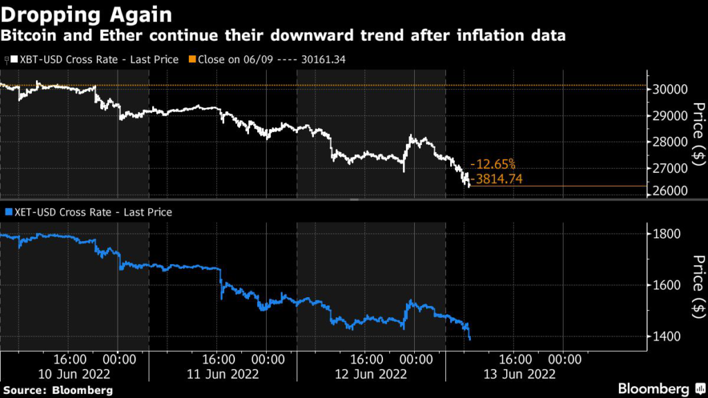 Ether fell as much as 9% to $1,342.32. Other coins tracked by Bloomberg including Cardano, Dogecoin, Polkadot and Avalanche were also in the red.