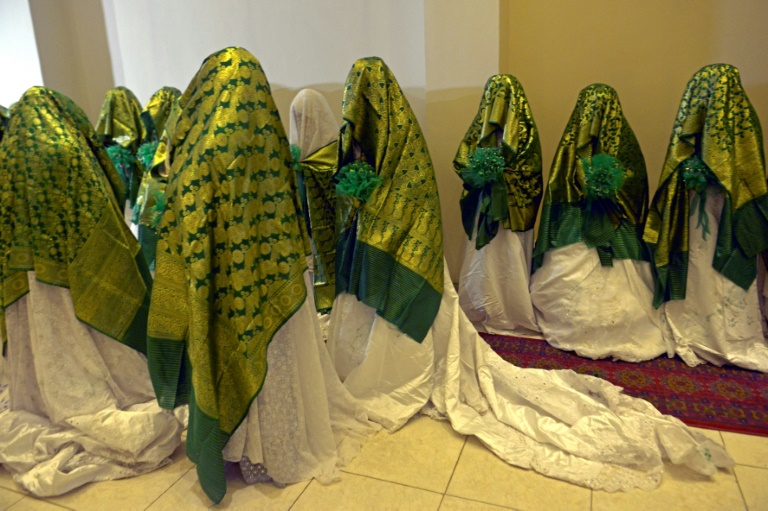 Journalists were not allowed to speak to the brides, who wore crisp white gowns under their concealing shawls, but were permitted to photograph and film them.