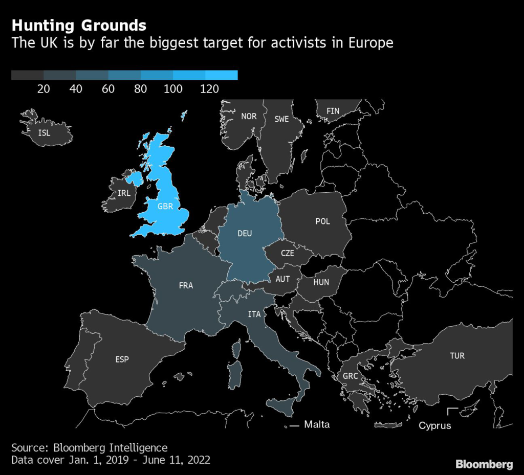 All told, the UK accounts for almost half of the 336 campaigns launched in Europe since the start of 2019, the Bloomberg Intelligence data show.
