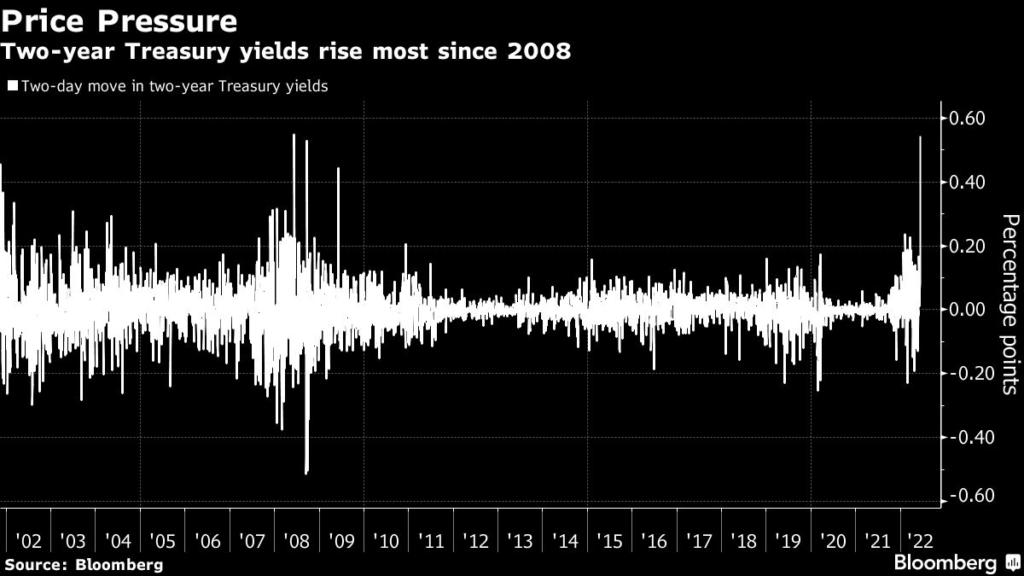 Two-year US Treasury yields surged 29 basis points as bond prices tanked. The yield jumped 54 basis points since Thursday night, the biggest two-day increase since 2008, a sign of just how rapidly traders are adjusting where they think the Federal Reserve will take interest rates.