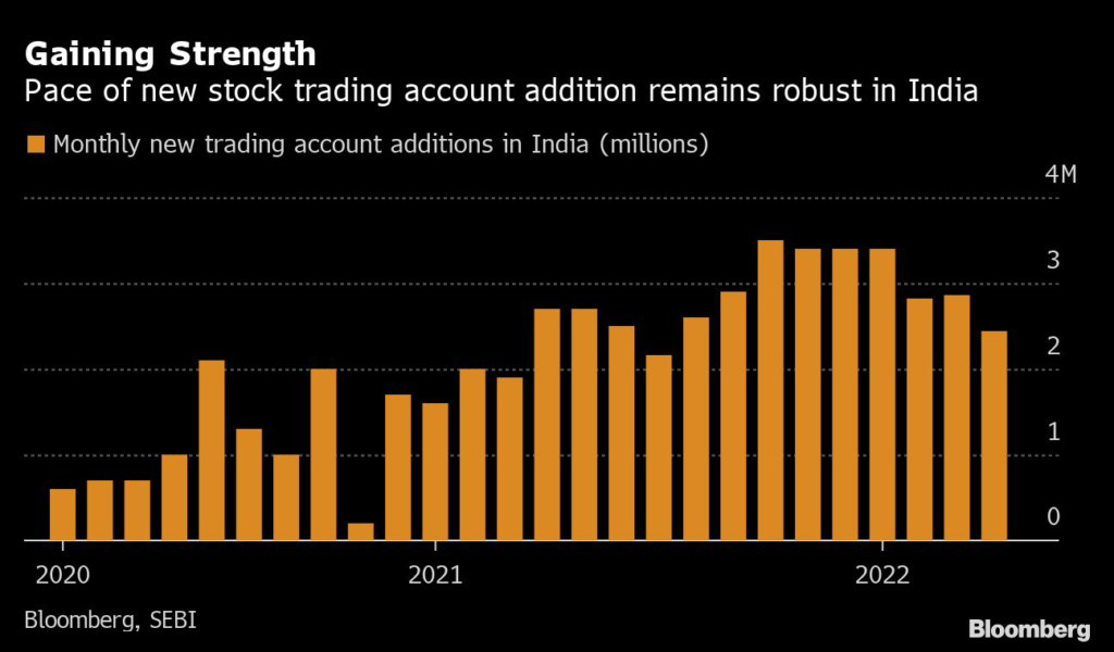 Long a nation where households squirreled away their savings in the bank, about 43 million equity accounts have been added in India since the beginning of 2021, more than the total populations of Belgium, Greece and Portugal put together.