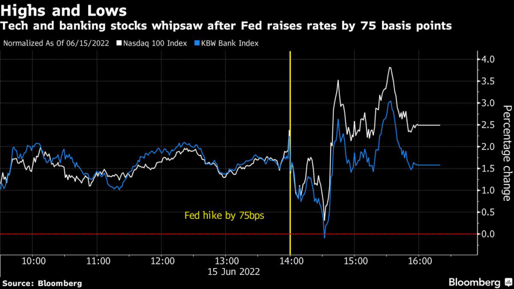 (Bloomberg) — Technology and financial stocks got a boost on Wednesday after the Federal Reserve raised rates by the most in nearly three decades but it ruled out signs of a broader economic slowdown.