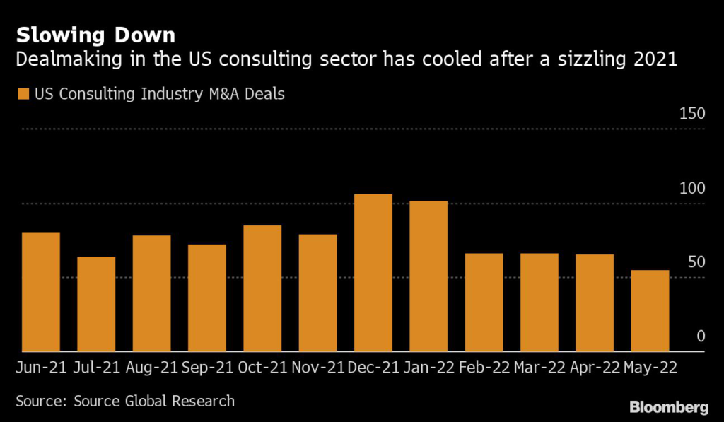 US consulting-industry mergers and acquisitions have cooled this year due to rising interest rates, Russia’s invasion of Ukraine and increased economic volatility, according to a report from London-based Source Global Research, which tracks the sector.