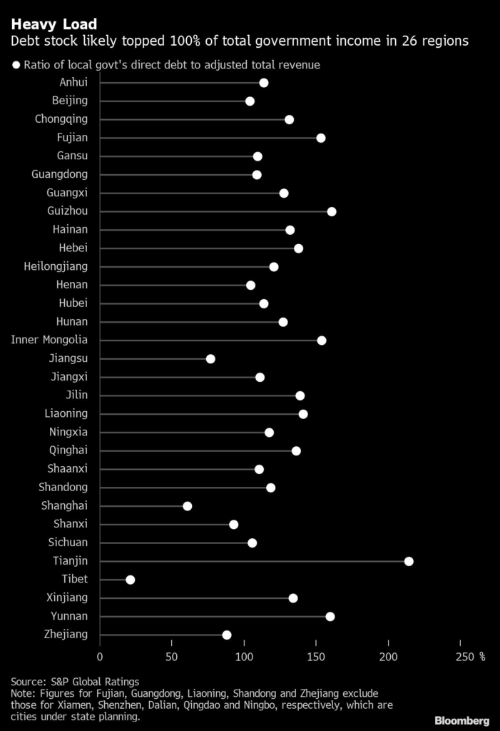 Even so, at the end of April 26 of 31 provinces had official debt worth more than 100% of their total 2021 revenue, according to S&P Global’s estimates.
