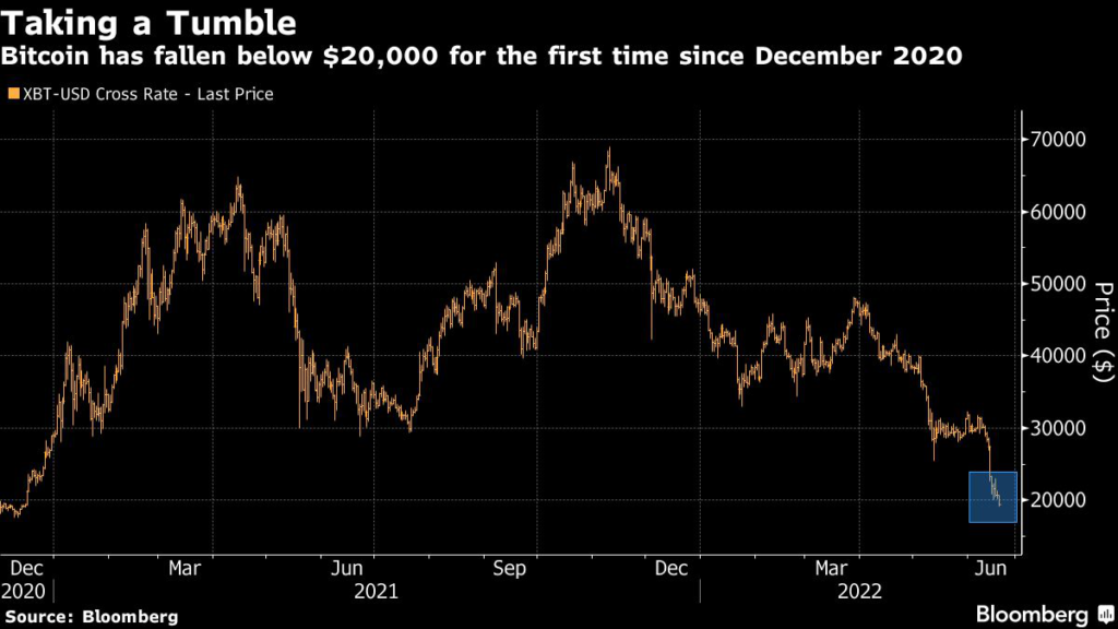 (Bloomberg) — Bitcoin dropped below $20,000 for the first time since December 2020 as evidence of deepening stress within the crypto industry keeps piling up against a backdrop of monetary tightening.